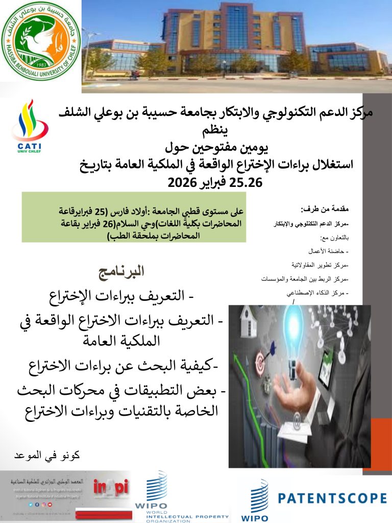 يومين تكوينيين حول موضوع: ” استغلال براءات الاختراع الواقعة في الملكية العامة”من تنظيم : مركز الدعم التكنولوجي والابتكار بالجامعة، و