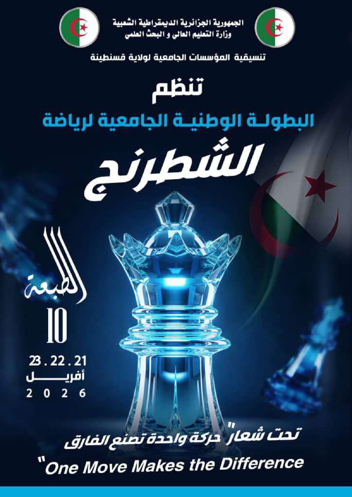 “تعلم المديرية الفرعية للانشطة العلمية الثقافية و الرياضية جميع طلبة الكلية في المشاركة وتمثيل الجامعة في البطولة الوطنية الجامعية للشطرنج وذلك قبل تاريخ 10