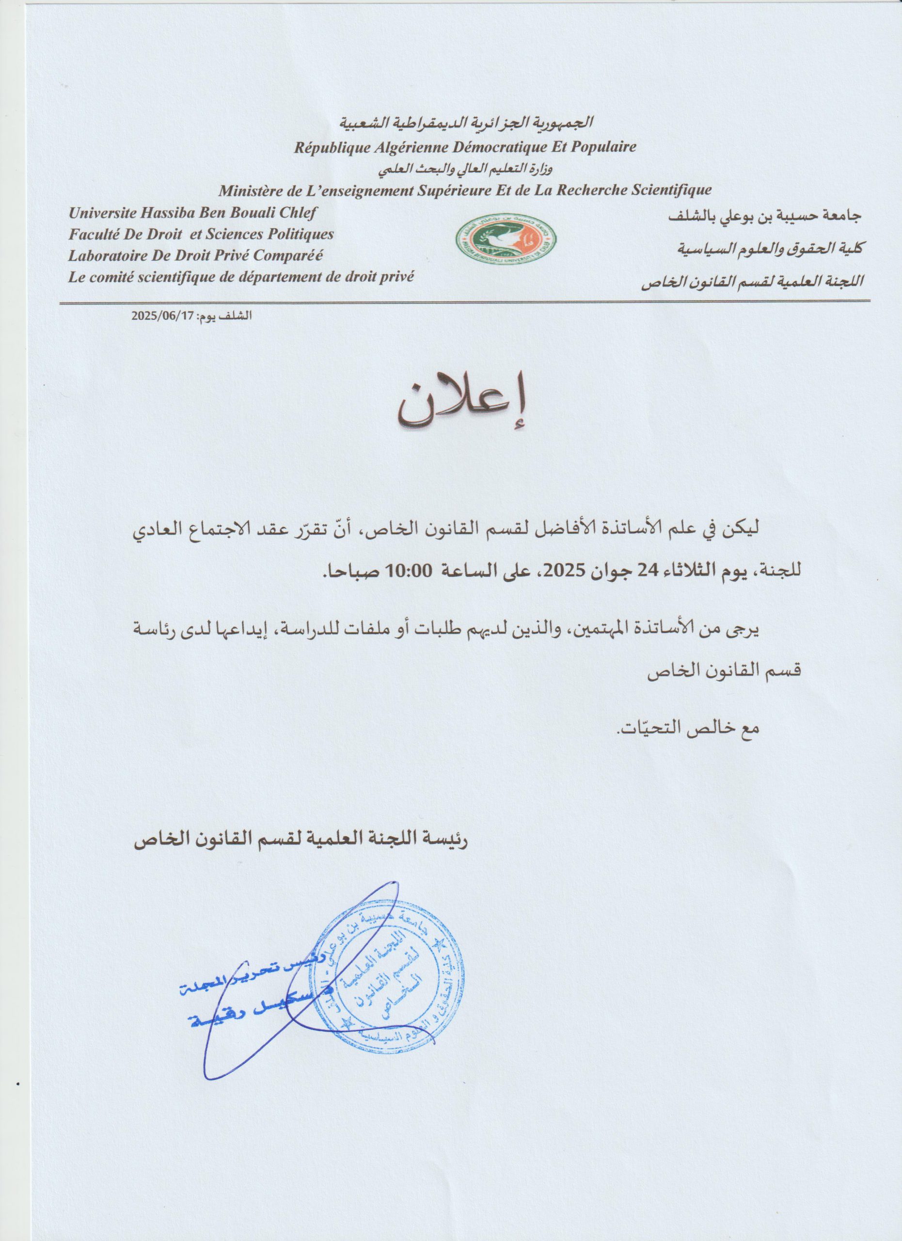 إعلان انعقاد اللجنة العلمية لقسم القانون الخاص
