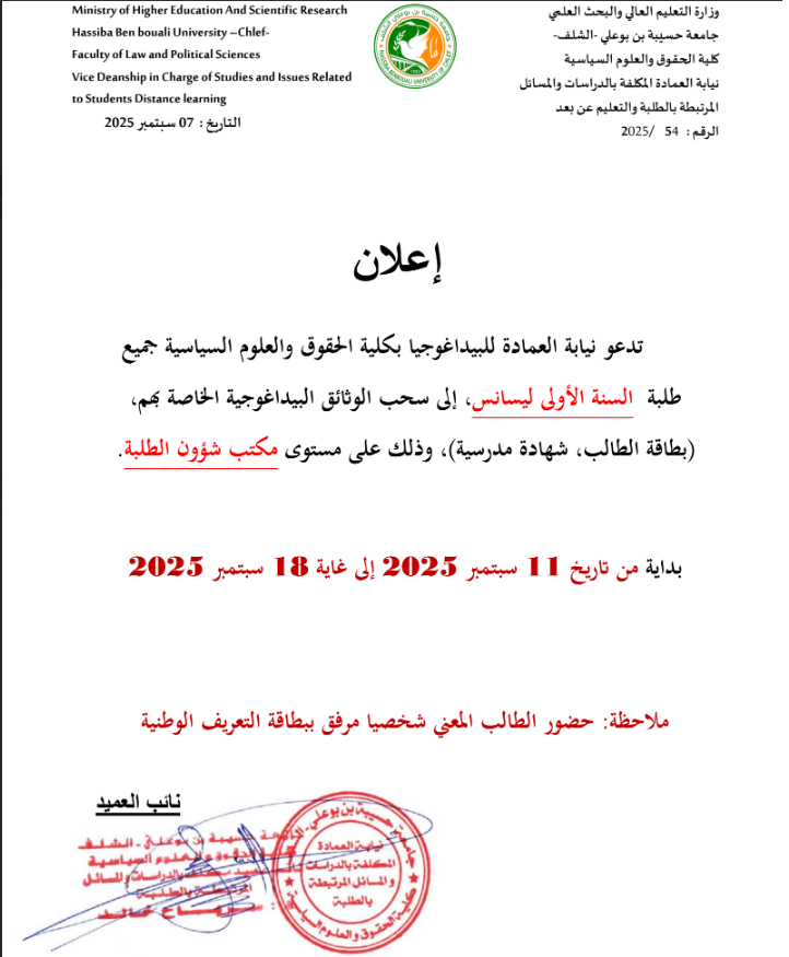 تدعو نيابة العمادة للبيداغوجيا بكلية الحقوق والعلوم السياسية جميع طلبة السنة الأولى ليسانس، إلى سحب الوثائق البيداغوجية الخاصة بهم، (بطاقة الطالب، شهادة مدرسية)، وذلك على مستوى مكتب شؤون الطلبة.
