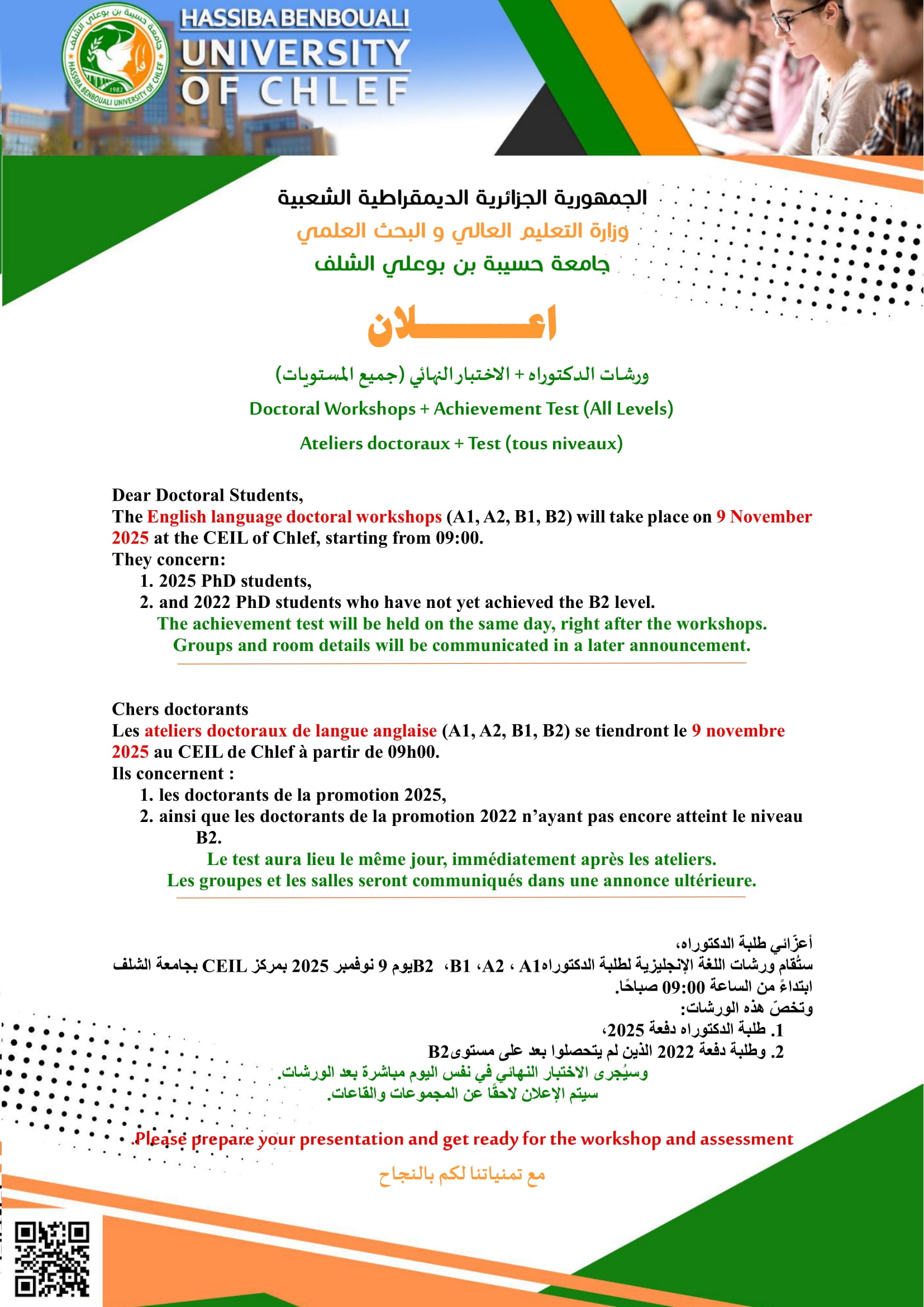 إعلان عن ورشات اللغة الإنجليزية لطلبة الدكتوراه