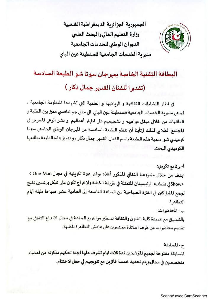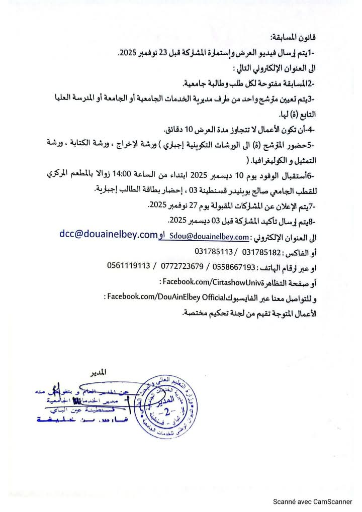 “تعلم المديرية الفرعية للانشطة العلمية الثقافية والرياضية طلبة الكلية الراغبين في المشاركة و تمثيل الجامعة في الطبعة السادسة للمهرجان الوطني “سيرتا شو” التقرب من مصالح الأنشطة العلمية الثقافية والرياضية على مستوى الكلية أو مقر المديرية الفرعية للأنشطة العلمية الثقافية والرياضية المتواجدة بمديرية الجامعة من أجل التسجيل قبل تاريخ 08 ديسمبر 2025 مرفوقين بالشهادة المدرسية للموسم الجامعي 2026/2025 “.