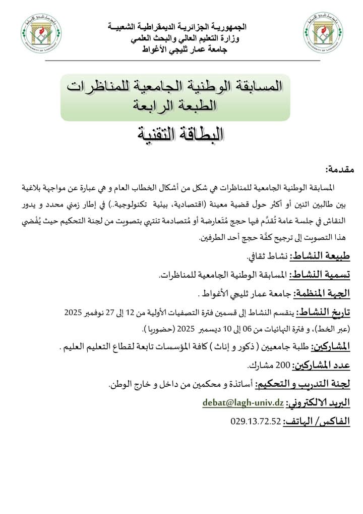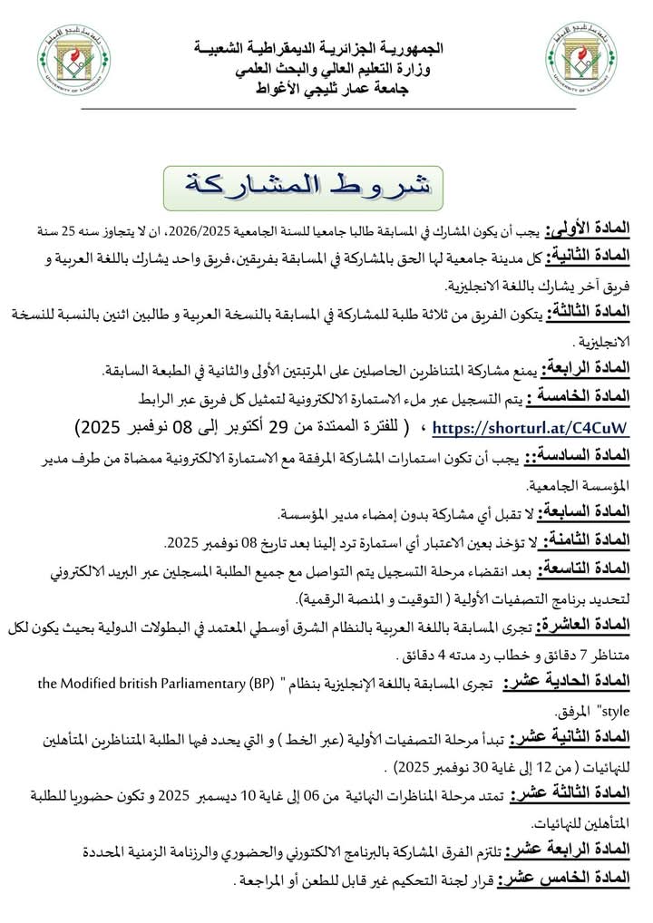 “تعلم المديرية الفرعية للانشطة العلمية الثقافية و الرياضية جميع طلبة الكلية الراغبين في المشاركة و تمثيل الجامعة في الطبعة الرابعة للمسابقة الوطنية الجامعية لافضل للمناظرات التقرب من مصالح الانشطة العلمية الثقافية و الرياضية على مستوى الكلية أو مقر المديرية الفرعية للأنشطة العلمية الثقافية و الرياضية المتواجدة بمديرية الجامعة من أجل التسجيل قبل تاريخ 08 نوفمبر 2025 مرفوقين بالشهادة المدرسية للموسم الجامعي 2026/2025 “.