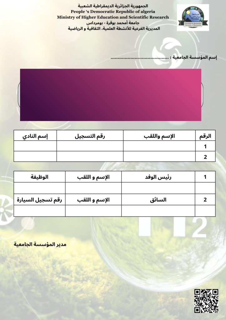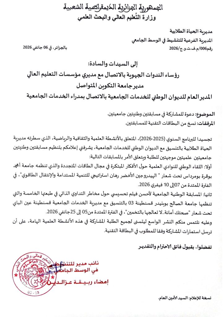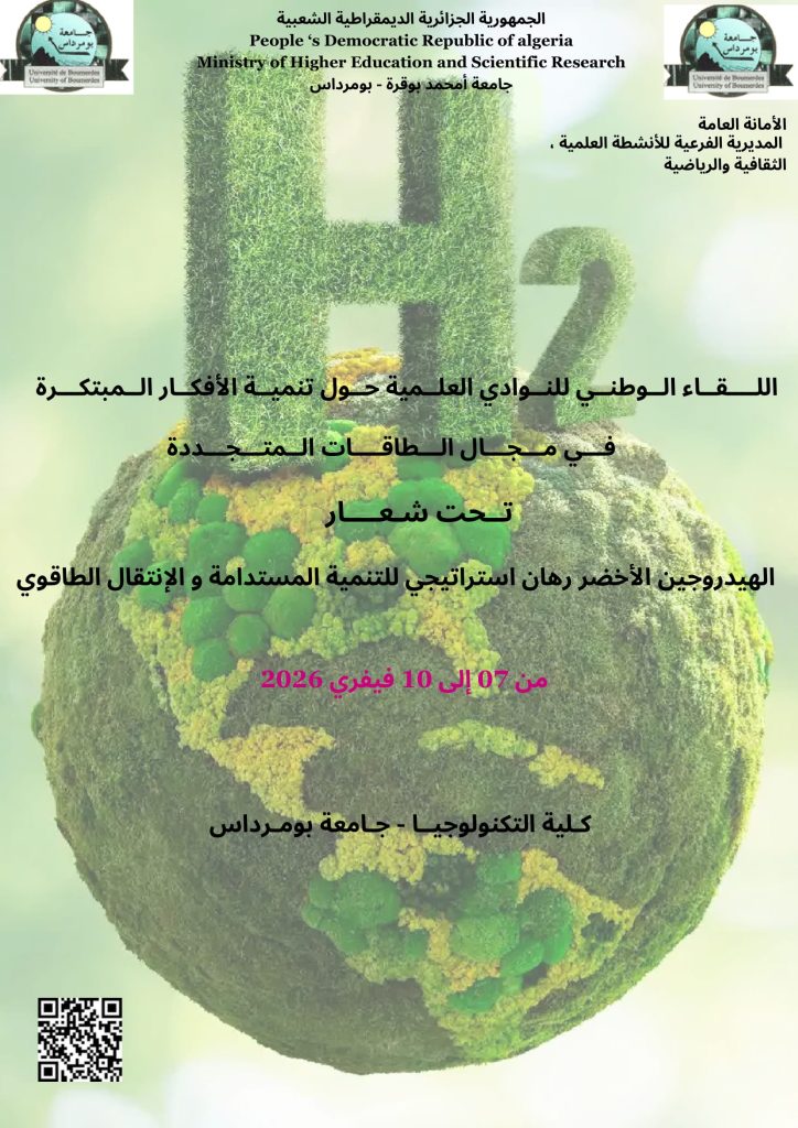 أولا: اللقاء الوطني للنوادي العلمية حول الأفكار المبتكرة في مجال الطاقات المتجددة والذي تنظمه جامعة أمحمد بوقرة بومرداس تحت شعار “الهيدروجين الأخضر” وذلك قبل تاريخ 02 فيفري 2026.
