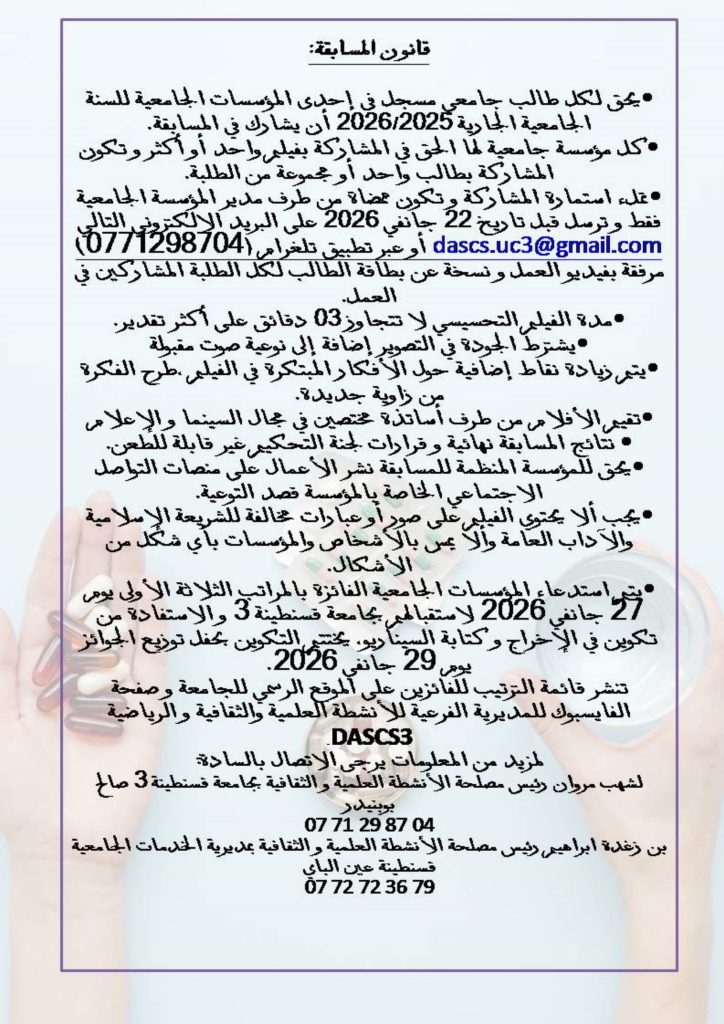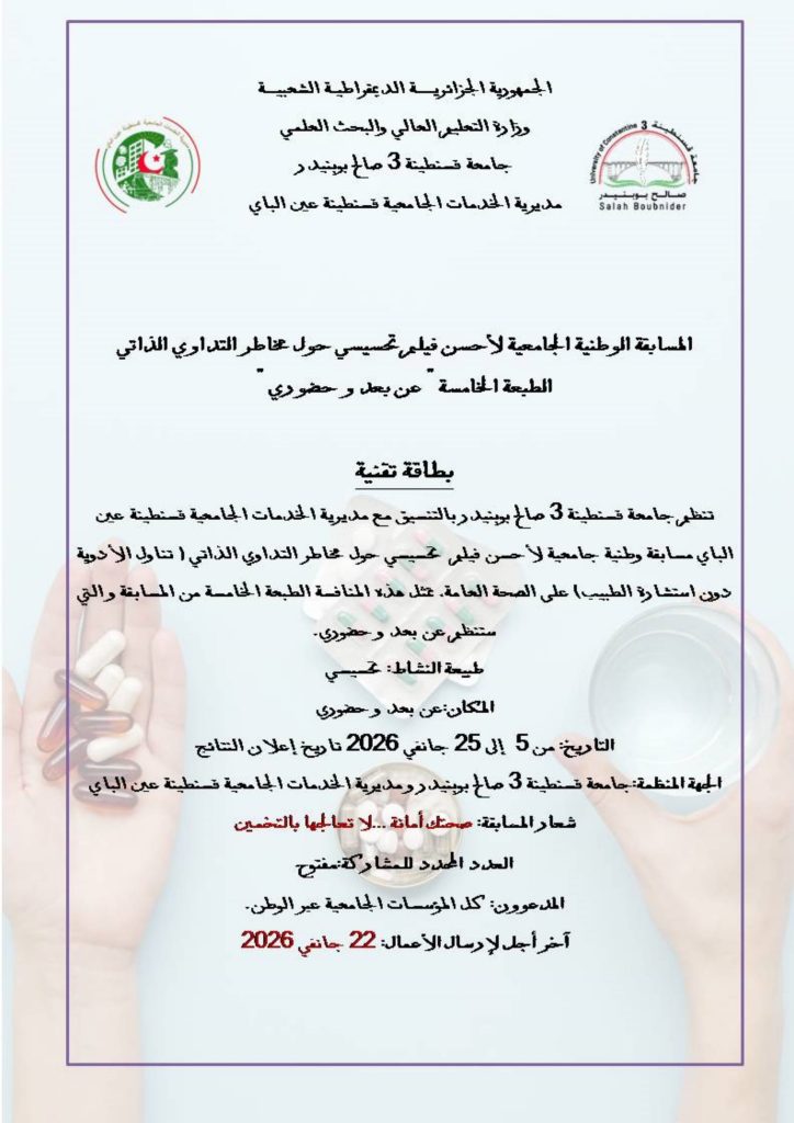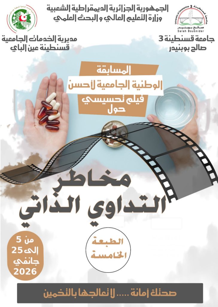 ثانيا: المسابقة الوطنية الجامعية لأحسن فيلم تحسيسي حول مخاطر التداوي الذاتي في طبعتها الخامسة والتي تنظمها جامعة الصالح بوبنيدر قسنطينة 03 بالتنسيق مع مديرية الخدمات الجامعية قسنطينة عين الباي تحت شعار: “صحتك أمانة..لا تعالجها بالتخمين”، وذلك قبل تاريخ 22 جانفي 2026، التقرب من مصالح الانشطة العلمية، الثقافية والرياضية على مستوى الكلية أو مقر المديرية الفرعية للأنشطة العلمية، الثقافية والرياضية المتواجدة بمديرية الجامعة من أجل التسجيل، مرفقين بالوثائق التالية: