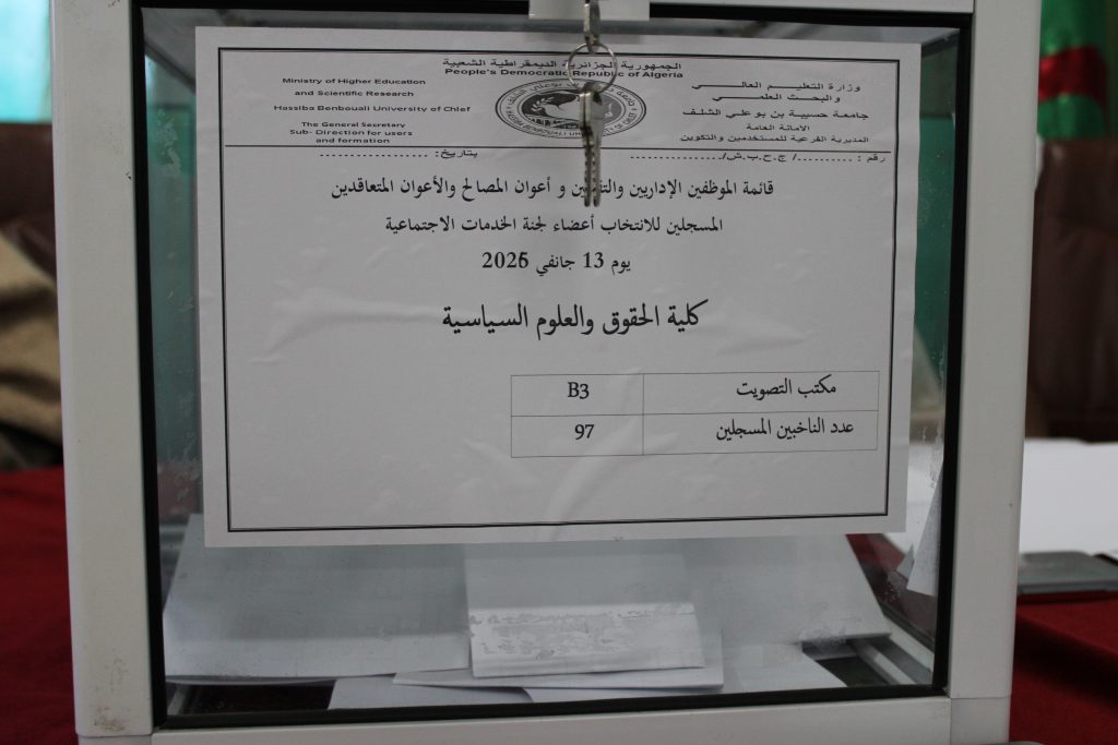 يوم 13 جانفي 2026، إجراء انتخابات لجنة الخدمات الاجتماعية لجامعة حسيبة بن بوعلي بالشلف، على مستوى فرع الاقتراع بكلية الحقوق والعلوم السياسية، وذلك من أجل اختيار ممثلي الموظفين والأساتذة.