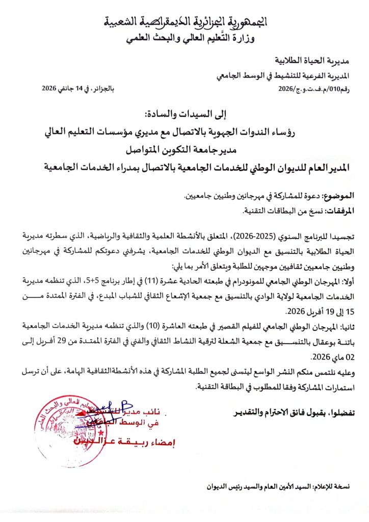 أولا: المهرجان الوطني الجامعي للمونودرام في طبعته الحادية عشرة (11) في إطار برنامج 5+5، الذي تنظمه مديرية الخدمات الجامعية لولاية الوادي بالتنسيق مع جمعية الإشعاع الثقافي للشباب المبدع، في الفترة الممتدة مـن 15 إلى 19 أفريل 2026.