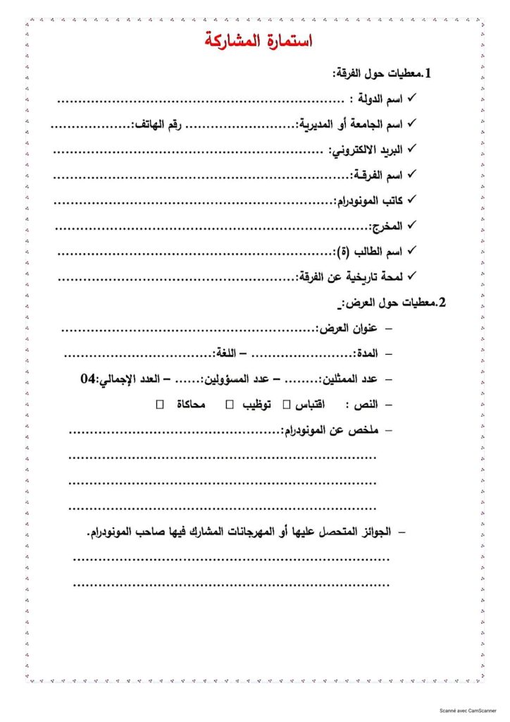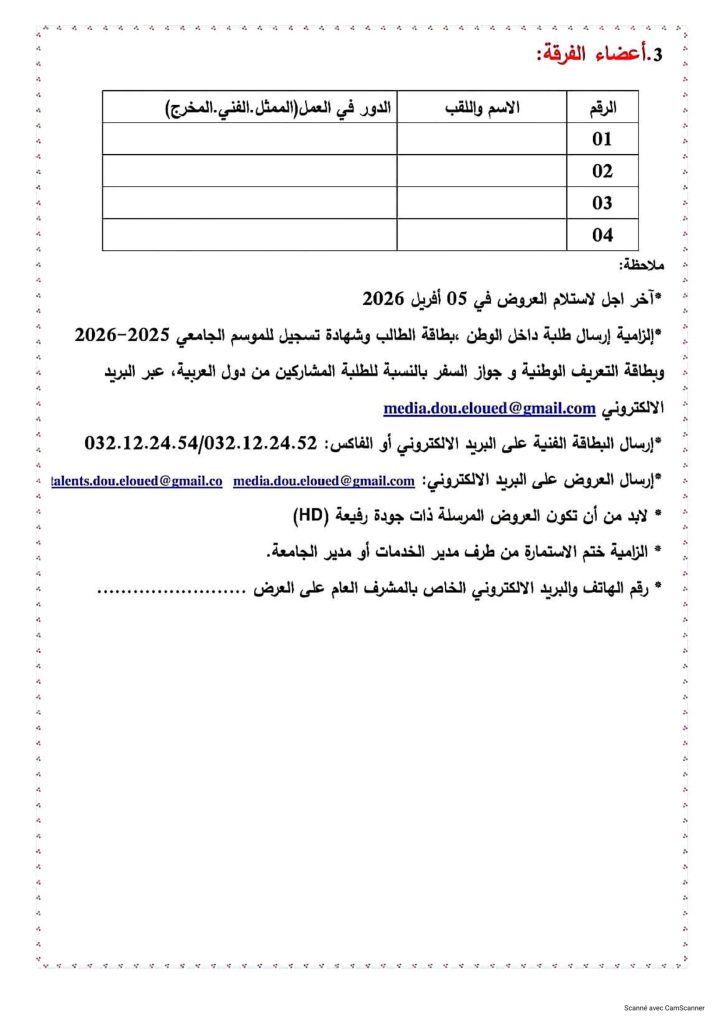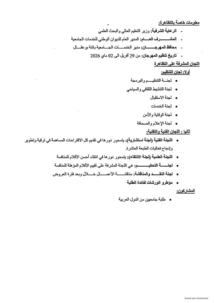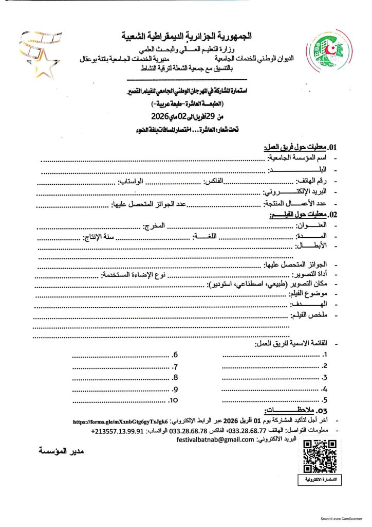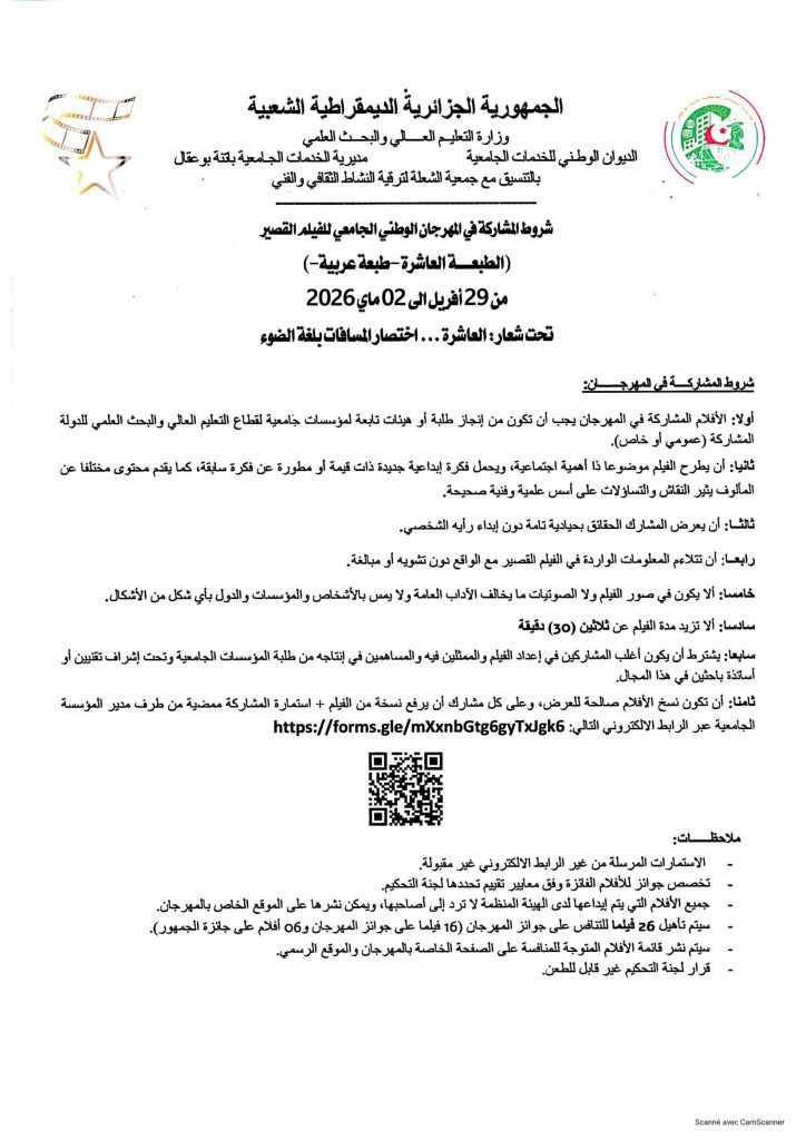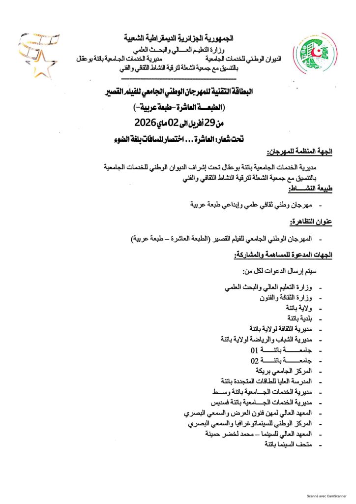 ثانيا: المهرجان الوطني الجامعي للفيلم القصير في طبعته العاشرة (10) والذي تنظمه مديرية الخدمات الجامعية باتنـــــــة بوعقال بالتنسـيق مع جمعية الشعلة لترقية النشاط الثقافي والفني في الفترة الممتدة من 29 أفريل إلى 02 ماي 2026، التقرب من مصالح الانشطة العلمية، الثقافية والرياضية على مستوى الكلية أو مقر المديرية الفرعية للأنشطة العلمية، الثقافية والرياضية المتواجدة بمديرية الجامعة من أجل التسجيل مرفقين بالوثائق التالية: