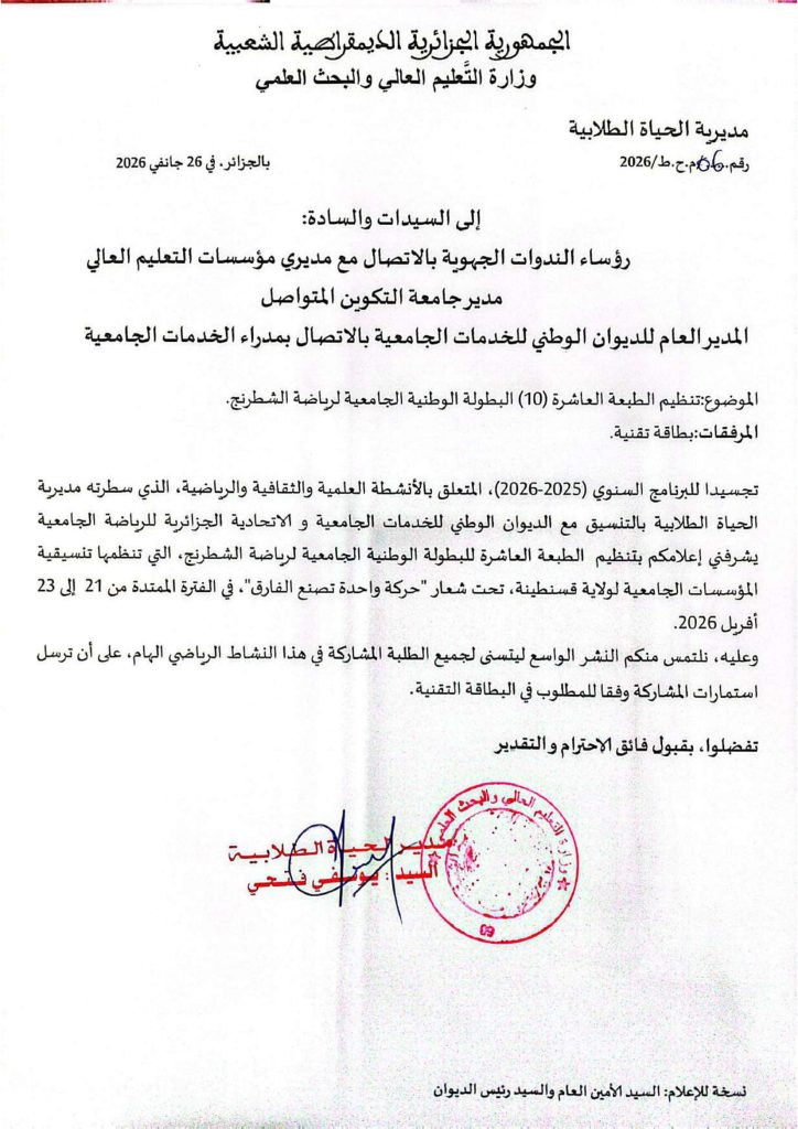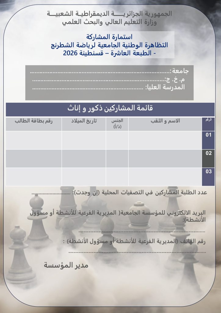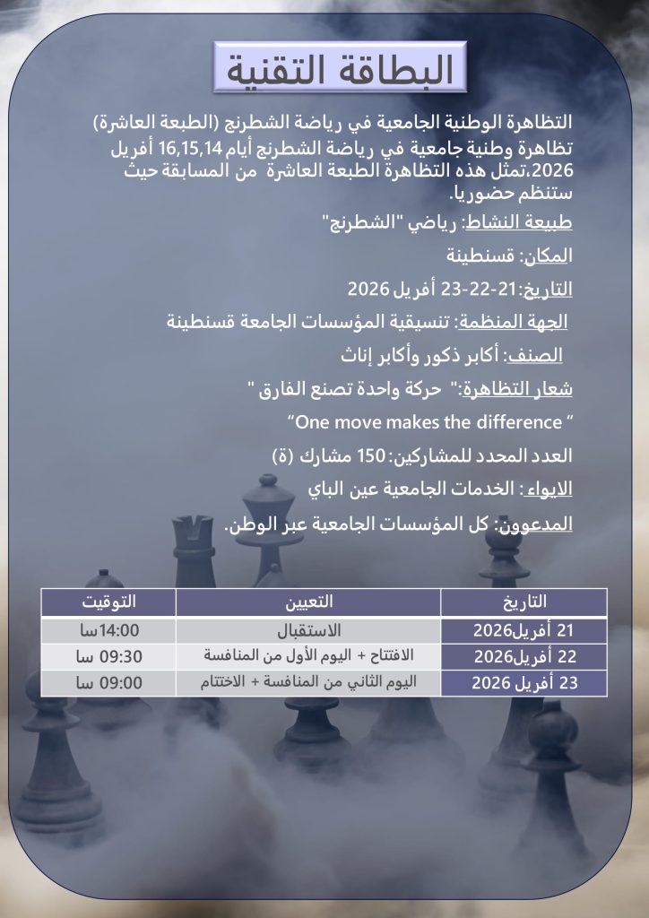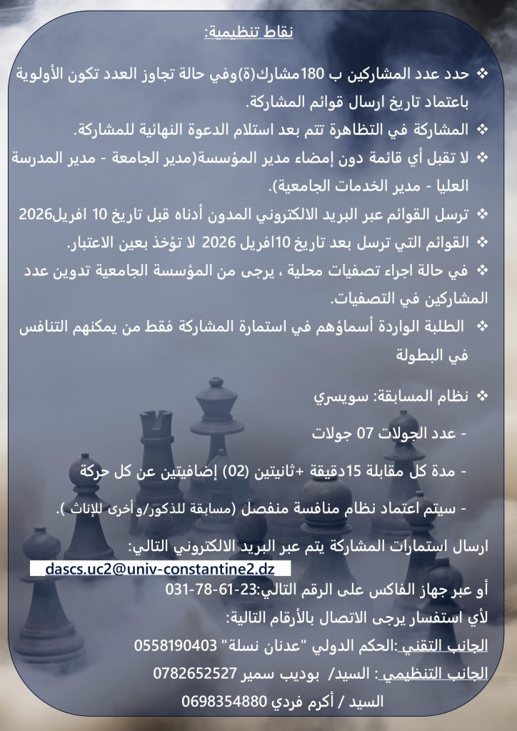 “تعلم المديرية الفرعية للانشطة العلمية الثقافية و الرياضية جميع طلبة الكلية في المشاركة وتمثيل الجامعة في البطولة الوطنية الجامعية للشطرنج وذلك قبل تاريخ 10 أفريل 2026، التقرب من مصالح الانشطة العلمية، الثقافية و الرياضية على مستوى الكلية أو مقر المديرية الفرعية للأنشطة العلمية، الثقافية والرياضية المتواجدة بمديرية الجامعة من أجل التسجيل مرفقين بالوثيقة التالية: