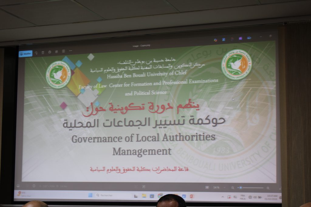 بتاريخ 01 فيفري 2026، انطلقت بكلية الحقوق والعلوم السياسية بجامعة الشلف دورة تكوينية خاصة بتحسين المستوى وتجديد المعارف، لفائدة إطارات وموظفي إدارة الجماعات المحلية والإقليمية لولاية الشلف، تحت عنوان: حوكمة تسيير الجماعات المحلية. وتمتد هذه الدورة التكوينية لمدة خمسة (05) أيام.