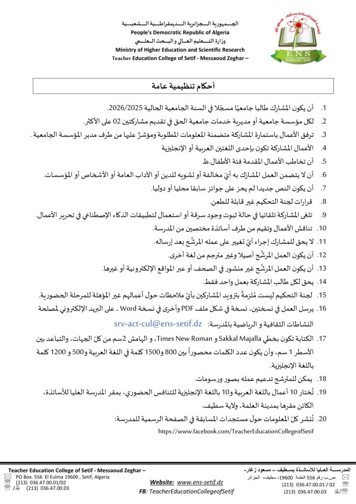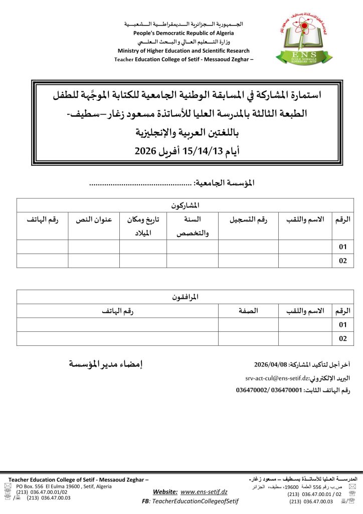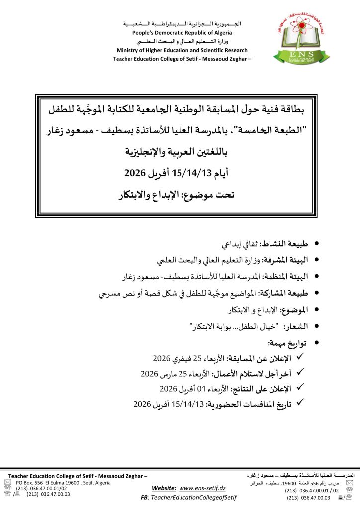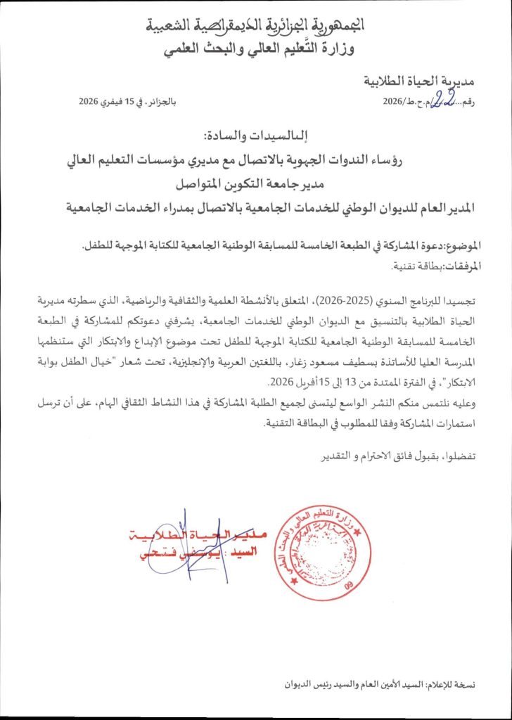 دعوة للمشاركة في الطبعة الخامسة للمسابقة الوطنية الجامعية للكتابةبواسطة kahina mahammedi / 18 فبراير، 2026