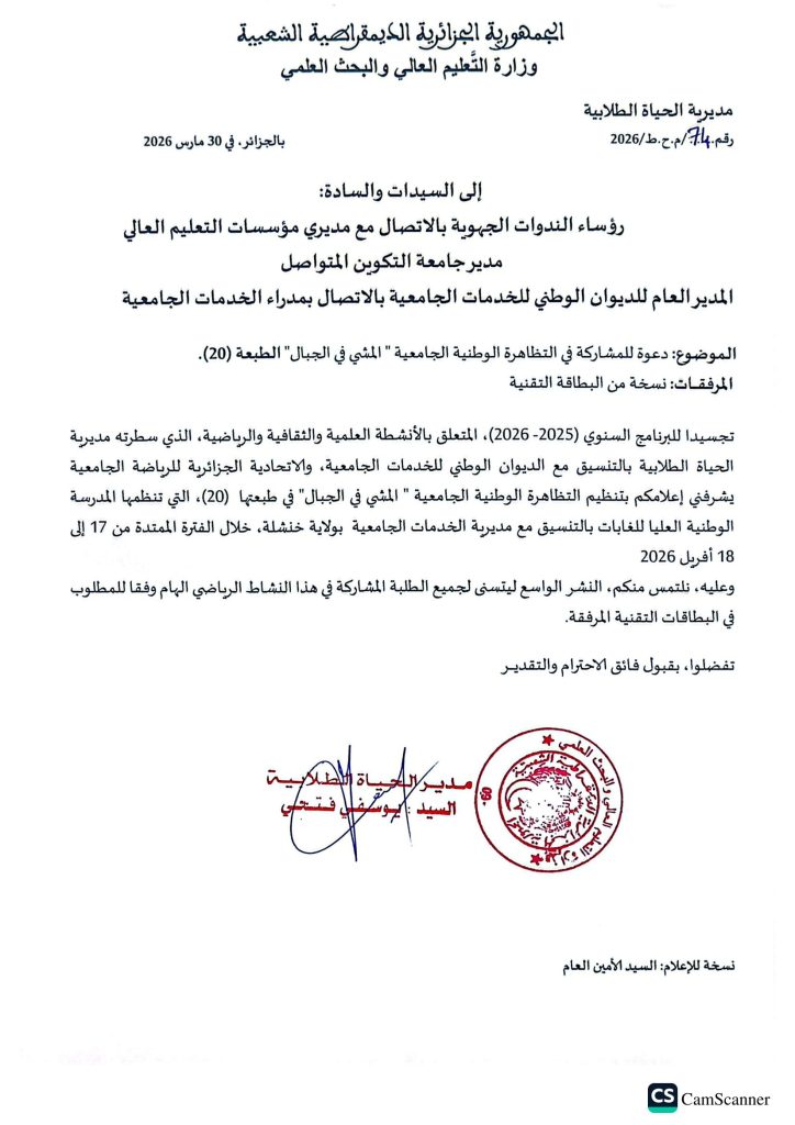 التظاهرة الوطنية الجامعية المشي في الجبال الطبعة (20) والتي تنظمها المدرسة الوطنية العليا للغابات بالتنسيق مع مديرية الخدمات الجامعية بولاية خنشلة في الفترة الممــــــــــــــــــتدة من 17 إلى 18 أفريل 2026.